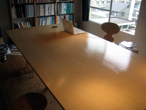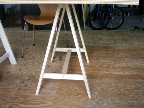 これは21ミリのシナ積層合板の4×8版(1.2m×2.4m)を切らずにそのまま使い、脚は春に横浜の